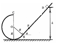 3、计算题  如图所示,倾角为θ=45°的粗糙长直导轨与半径?为R的光滑圆环轨道相切,切点为B,整个轨道处在竖直平面内。一质量为m的小滑块从导轨上离地面高为h=3R的D处无初速下滑进入圆环轨道。接着小滑块从圆环最高点C水平飞出,恰好击中导轨上与圆心O等高的P点,不计空气阻力。求: