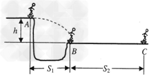 1、计算题 某滑板爱好者在离地h=1.8m高的平台上滑行,水平离开A点后落在水平地面的B点,其水平位移S1=3m,着地时由于存在能量损失,着地后速度变为v=4m/s,并以此为初速沿水平地面滑行S2 =8m后停止.已知人与滑板的总质量m=60kg.求?