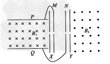3、计算题 如图所示,P、Q是相距为d的水平放置的两平行金属板,P、Q间有垂直于纸面向里、磁感应强度为B1的匀强磁场,M、N是竖直放置的两平行金属板,用导线将P与M相连、Q与N相连,X是平行于M和N的竖直绝缘挡板,Y是平行于M和N的荧光屏,X、M、N、Y的中间各有一个小孔,所有小孔在同一水平轴线上,荧光屏的右侧有垂直于纸面向外的匀强磁场,现有大量的正、负粒子(电荷量的大小均为q,质量均为m)不断地以相同的速度垂直于磁场水平向右射入金属板P、Q之间,忽略电场的边缘效应,不计粒子的重力和粒子之间相互作用。