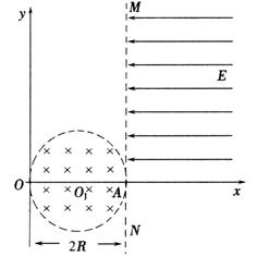 2、计算题 (20分)如图所示,磁感应强度大小为B=0.15T,方向垂直纸面向里的匀强磁场分布在半径R=0.20m的圆形区域内,圆的左端跟y轴相切于直角坐标系原点O,右端与边界MN相切于x轴上的A点.MN右侧有平行于x轴负方向的匀强电场.置于坐标原点O的粒子源,可沿x轴正方向射出速度的带正电的粒子流,比荷为