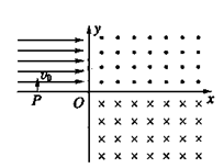 5、计算题 如图所示,在平面直角坐标系xOy内,第Ⅰ象限存在沿y轴负方向的匀强电场,第Ⅳ象限以ON为直径的半圆形区域内,存在垂直于坐标平面向外的匀强磁场,磁感应强度为B。一质量为m、电荷量为q的带正电的粒子,从y轴上y=h处的M点,以速度v0垂直于y轴射入电场,经x轴上x=2h处的P点进入磁场,最后以垂直于y轴的方向射出磁场。不计粒子重力。求: