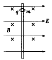 1、计算题 如图所示,在互相垂直的水平方向的匀强电场(E已知)和匀强磁场(B已知)中。有一固定的竖直绝缘杆,杆上套一个质量为m,电荷量为-q的小球,它们之间的动摩擦因数为μ,现由静止释放小球,试分析小球运动的加速度和速度的变化情况,并求出最大速度(mg>μqE)。