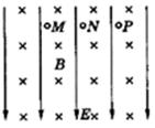 2、选择题 如图所示,匀强电场E的方向竖直向下,匀强磁场B的方向垂直纸面向里,让三个带有等量同种电荷的油滴M、N、P进入该区域中,M进入后能向左做匀速运动,N进入后能在竖直平面内做匀速圆周运动,P进入后能向右做匀速运动,不计空气阻力,则三个油滴的质量关系是(? )