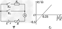 3、选择题 如图甲所示,R为电阻箱(0~99.9 Ω),置于阻值最大位置,Rx为未知电阻,(1)断开K2,闭合K1,逐次减小电阻箱的阻值,得到一组R、I值,并依据R、I值作出了如图乙所示的R-