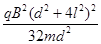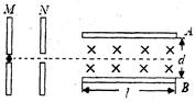 3、计算题 (10分)如图所示,A、B为一对平行板,板长为L,两板距离为d,板间区域内充满着匀强磁场,磁感应强度大小为B,方向垂直纸面向里,一个质量为m,带电荷量为+q的带电粒子自静止开始经M、N两平行金属板间的电场加速后,从A、B两板的中间沿垂直于磁感线的方向射入磁场。(不计粒子的重力)求: