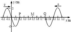 4、计算题  (9分)两列简谐横波分别沿x轴正方向和负方向传播,波速均为υ=0.4m/s,波源的振幅均为A=2cm。如图所示为t=0时刻两列波的图象,此刻平衡位置在x=0.2m和x=0.8m的P、Q两质点恰好开始振动。质点M的平衡位置位于x=0.5m处。求: