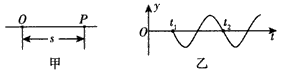 2、选择题  如图甲所示,O点为振源,OP距离为s,t=0时刻,O点从平衡位置开始向下(y负方向)振动,产生向右沿直线传播的简谐横波,图乙为P点的振动图象(从t1时刻开始振动),则