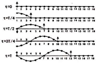 4、选择题 如图是一条软绳,绳上选有18个质点,质点1在外力作用下首先向上振动,其余质点在相互作用力的带动下依次振动,从而形成简谐波。由波的形成及图示可知,下列说法中错误的是(?)