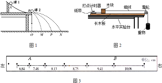 Ⅱ某实验小组想测量木板对木块的摩擦力所做的功.装置如图2,一木块放在粗糙的水平长木板上,右侧栓有一细线,跨过固定在木板边缘的滑轮与重物连接,木块左侧与穿过打点计时器的纸带相连,长木板固定在水平实验台上.实验时,木块在重物牵引下向右运动,重物落地后,木块继续向右做匀减速运动,图3给出了重物落地后打点计时器打出的纸带,系列小黑点是计数点,每相邻两计数点间还有4个点(图中未标出),计数点间的距离如图所示.打点计时器所用交流电频率为50Hz,不计纸带与木块间的拉力.
