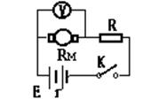 4、计算题 如图所示,一电动机与一电阻R串联接在电源上,电源电动势E=20V,内电阻r=1Ω,用理想电压表测出电动机两端的电压为10V,已知电动机的内阻RM=1Ω,电阻R=9Ω,