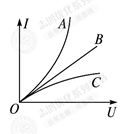 4、选择题 元件A、B、C的伏安曲线如图所示,三个元件在相同的电压作用下,相同时间内发出的热量、
