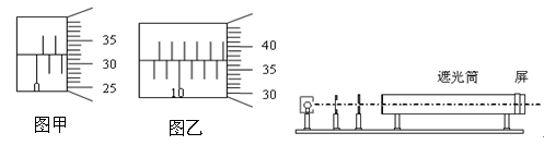 (2)将测量头的分划板中心刻线与某亮纹的中心对齐,将该亮纹定为第一条亮纹,此时手轮上的示数如图甲所示,记为x1。然后同方向转动测量头,使分划板中心刻线与第六条亮纹中心对齐,此时手轮上的示数如图乙所示,记为x2。则x2= mm
