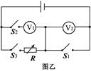 小题2:由于电压表和电流表内阻的影响,下图甲所示电路存在系统误差,为了消除这一影响,某同学设计了如下的实验方案:选择两块量程合适的电压表V1和V2,一个满足实验要求的电阻箱R,电键若干。设计如下图乙所示的测量电路,该同学进行了如下的主要测量步骤: