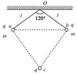 3、选择题 如右图所示,将两个摆长均为l的单摆悬于O点,摆球质量均为m,带电荷量均为q(q>0).将另一个带电荷量也为q(q>0)的小球从O点正下方较远处缓慢移向O点,当三个带电小球分别处在等边三角形abc的三个顶点上时,摆线的夹角恰好为120°,则此时摆线上的拉力大小等于( )