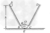 3、计算题 如图所示,AB与CD为两个对称斜面,其上部足够长,下部分别与一个光滑的圆弧面的两端相切,圆弧的圆心角为120°,半径R为2.0m,一个物体在离弧底(E)高度h为3.0m处,以初速度4.0m/s沿斜面运动。若物体与两个斜面的动摩擦因数μ均为0. 02,则物体在两个斜面上(不包括圆弧部分)一共能走多少米?(取g=10m/s2)