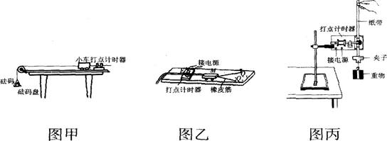 4、实验题 下列几个图分别是探究“功与物体速度变化的关系”实验、“探究加速度与物体质量、物体受力的关系”的实验和“验证机械能守恒定律”实验装置图。其中探究“功和物体速度变化的关系”实验装置图是 (填写“甲”、“乙”、“丙”);图甲中由于用砝码和砝码盘的总重力代替小车拉力,因此要求砝码和砝码盘的总质量 小车的质量(填写“大于”、“小于”、“远大于”、“远小于”);图甲中实验前需平衡摩擦力,平衡摩擦力时砝码盆?挂上;(填写“需要”、“不需”)这三个实验都使用了打点计时器,打点计时器用 电源(填写“直流”、“交流”、“交直流均可”)。在这三个实验挑选出的纸带中,其中有一条纸带中有一段打出的点间隔是均匀的,则这条纸带一定是实验装置图 (填写“甲”、“乙”、“丙”)中实验得到的。