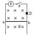 3、选择题 如图所示,竖直平面内有一足够长的金属导轨,质量为m、长为l金属导体棒ab可在导轨上无摩擦地上下滑动,且导体棒ab与金属导轨接触良好,ab电阻为R,D为理想二极管,其它电阻不计。导体棒ab由静止开始下落,不计空气阻力,经过一段时间后闭合电键S,则在以后导体棒ab的运动过程中,下列说法中正确的是?