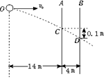 5、填空题 如图,子弹从O点水平射出,初速度为v0,穿过两块竖直放置的薄挡板A和B,留下弹孔C和D,测量C和D的高度差为0.1 m,两板间距4 m,A板离O点的水平距离为14 m,不计挡板和空气的阻力,则v0="________" m/s (g=10 m/s2)