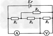 4、选择题 如图所示,电池的电动势为3V,内阻为0.6Ω。且R1=R2=R3=R4=4Ω。两电表为理想电表,下列说法正确的是?