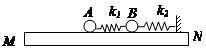 3、计算题 上表面光滑的木板MN上有一固定挡板,原长相同的两轻质弹簧k1、k2如图示与两质量均为m的小球A、B和固定挡板连接,当木板水平放置时,两弹簧均处于原长状态,缓慢抬起木板的N端,当木板与水平面成300时,k1、k2长度之比为6:7,当AB转至竖直时k1、k2长度之比为7:9,求: