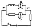 4、选择题 如图所示的电路中,两个灵敏电流表G1和G2的零点都在刻度盘中央,当电流从“+”接线柱流入时,指针向右摆;电流从“一”接线柱流入时,指针向左摆。在电路接通后再断开的瞬间,下列说法中符合实际情况的是