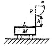 2、计算题  如图所示,在小车的右端高h=0.20m的支架上固定着一个半径为R的1/4圆弧光滑导轨,一质量为研= 0.2kg的物体从圆弧的顶端无摩擦地滑下,离开圆弧后刚好落到车的左端边沿,车与支架的总质量M=2kg,车身长L=0.22m,车与水平地面间的摩擦不计,重力加速度g =10m/s2,求:
