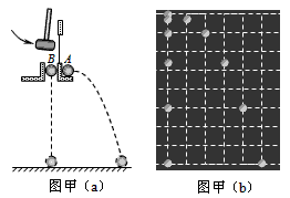 4、实验题 图甲(a)是一个能够显示平抛运动及其特点的演示实验,用小锤敲击弹性金属片,小球A就沿水平方向飞出,做平抛运动;同时小球B被松开,做自由落体运动。图甲(b)是该装置一次实验的数码连拍照片,同时显示了A、B球分别做平抛运动和自由落体运动的轨迹。