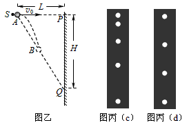 (2)现在重新设计该实验,如图乙所示,光源位于S点,紧靠着光源的前方有一个小球A,光照射A球时在竖直屏幕上形成影子P。现打开数码相机,同时将小球向着垂直于屏幕的方向水平抛出,不计空气阻力,小球的影像P在屏幕上移动情况即被数码相机用连拍功能(每隔相同的时间自动拍摄一次)拍摄下来,如图丙所示。则小球的影像P在屏上移动情况应当是图丙中的___________(选填“c”或“d”)。