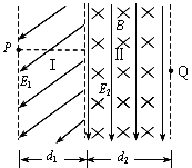 4、计算题 如图,区域I内有与水平方向成45°角的匀强电场E1,区域宽度为d 1,区域Ⅱ内有正交的有界匀强磁场B和匀强电场E 2,区域宽度为d 2,磁场方向垂直纸面向里,电场方向竖直向下。一质量为m、电量大小为q的微粒在区域I左边界的P点,由静止释放后水平向右做直线运动,进入区域Ⅱ后做匀速圆周运动,从区域Ⅱ右边界上的Q点穿出,其速度方向改变了30°,重力加速度为g ,求:
