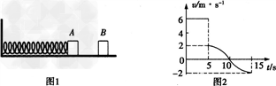 如图1所示,物体A的质量是4 kg,轻弹簧一端连接A,另一端固定在竖直墙壁上,水平面光滑。物体B水平向左运动,在t=5 s时与物体A相碰,并立即与A有相同的速度,一起向左运动,物块B的速度一时间图象如图2所示。?