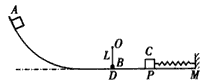 3、计算题 如图所示,竖直放置的圆弧轨道和水平轨道两部分相连。水平轨道的右侧有一质量为2m的滑块C与轻质弹簧的一端相连,弹簧的另一端固定在竖直的墙M上,弹簧处于原长时,滑块C静止在P点处;在水平轨道上方O处,用长为L的细线悬挂一质量为m的小球B,B球恰好与水平轨道相切,并可绕O点在竖直平面内摆动,质量为m的滑块A由圆弧轨道上静止释放,进入水平轨道与小球B发生弹性碰撞。P点左方的轨道光滑、右方粗糙,滑块A、C与PM段的动摩擦因数均为μ=0.5,A、B、C均可视为质点,重力加速度为g。则: