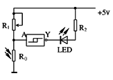 ”是具有特殊功能的非门,当加在它的输入端A的电压逐渐上升到某个值时,输出端Y会突然从高电平跳到低电平,而当输入端A的电压下降到另一个值时,Y会从低电平跳到高电平。在天暗时路灯(发光二极管)会点亮,下列说法中正确的是