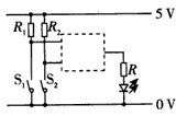 4、其他 下图是应用某种逻辑电路制作的车门报警电路,图中的两个按钮开关分别装在汽车的两扇门上,只要任何一个开关处于开路状态(输入为逻辑1,那么输出也是逻辑1),发光二极管(警报灯)就发光,请你根据要求,在电路图的虚线框内画出门电路符号。