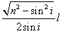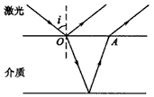4、计算题 如图所示,一束激光从O点由空气射入厚度均匀的介质,经下表面反射后,从上面的A点射出。已知入射角为i,A与O相距l,介质的折射率为n,试求介质的厚度d。