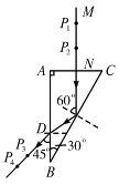 2、计算题 如图13-1-22所示,用某种透光物质制成的三棱镜ABC,在垂直于AC面的直线MN上插两枚大头针P1、P2,在AB面的左侧透过棱镜观察大头针P1、P2的像_____________,调整视线方向,直到P1的像,再在观察的这一侧先后插上两枚大头针P3、P4,使P3_____________,P4_____________.记下P3、P4的位置,移去大头针和三棱镜,过P3、P4的位置作直线与AB面相交于D,量出该直线与AB面的夹角为45°.则该透光物质的折射率n=_____________,并在图中画出正确完整的光路图.