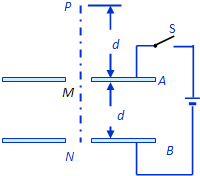 4、选择题 如图所示,A、B为平行金属板,两板相距d,分别与电源两极相连,两板的中央各有一个小孔M、N.开关S先闭合,今有一带电粒子自A板上方相距为d的P点由静止自由下落,空气阻力不计,到达N孔时速度恰好为零,然后沿原路返回.(P、M、N在同一竖直线上,且忽略极板的边缘效应),则( )