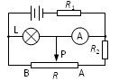 2、计算题 如图所示电路,电源内阻r=1Ω,R1=2Ω,R2=5Ω,灯L标有“3V,1.5W”,滑线变阻器最大值为R,当滑片P滑到最右端A时,电流表读数为1A,此