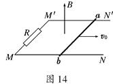 2、计算题 如图14所示,光滑的U形金属导轨MNN′M′水平的固定在竖直向上的匀强磁场中,磁感应强度为B,导轨的宽度为L,其长度足够长,M′、M之间接有一个阻值为R的电阻,其余部分电阻不计.一质量为m、电阻也为R的金属棒ab恰能放在导轨之上,并与导轨接触良好.给棒施加一个水平向右的瞬间作用力,棒就沿轨道以初速度v0开始向右滑行.求: