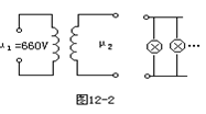 4、简答题  图12-2中,降压变压器的变压系数是3,即初级线圈匝数与次级线圈的匝数之比是3。初级线圈的输入电压是660V,次级线圈的电阻为0.2Ω,这台变压器供给100盏220V,60W的电灯用电。