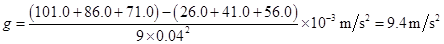 5、实验题 如图所示,用包有白纸的圆柱形铁棒替代纸带和重物,蘸有颜料的毛笔固定在电动机上并随之匀速转动,使之替代打点计时器。当烧断悬挂圆柱形铁棒的线后,圆柱形铁棒竖直自由下落,毛笔就在圆柱形铁棒上的纸面上画出一些印记,取下白纸后将其中一部分印记依次标为A、B、C、D、E、F、G。测得记号之间的距离依次为AB=26.0mm、BC=41.0mm、CD=56.0mm、DE=71.0mm、EF=86.0mm、FG=101.0mm,已知电动机铭牌上标有“1500r/min”字样,且毛笔对铁棒的运动的影响可以忽略,设由此测得当地的重力加速度。请回答下列问题: