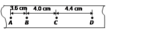 5、实验题 电磁打点计时器是一种使用?(选填“直流”或“交流”)电源的计时仪器,电源的频率是50 Hz时,在某次“练习使用打点计时器”实验中,其中一段打点纸带如图所示,A、B、C、D是连续打出的四个点.由图中数据可知,纸带的运动是?(选填“匀速”或“变速”)运动,物体的加速度是______m/s2。