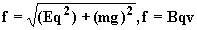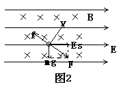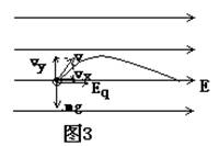 本题解析:题中带电微粒在叠加场中作匀速直线运动,意味着微粒受到的重力、电场力和磁场力平衡。进一步的分析可知:洛仑兹力f与重力、电场力的合力F等值反向,微粒运动速度V与f垂直,如图2。当撤去磁场后,带电微粒作匀变速曲线运动,可将此曲线运动分解为水平方向和竖直方向两个匀变速直线运动来处理,如图3。由图2可知: