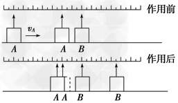 5、计算题  如图是AB两滑块碰撞前后的闪光照片示意图(部分),图中滑块A的质量为0.14 kg,滑块B的质量为0.22 kg,所用标尺的最小分度值是0.5 cm,每秒闪光10次,试根据图示回答: