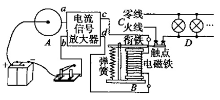 4、简答题 光电管在各种自动化装置中有很多应用,街道的路灯自动控制开关就是其应用之一,如图所示为其模拟电路,其中A为光电管,B为电磁继电器,C为照明电路,D为路灯。试简述其工作原理。