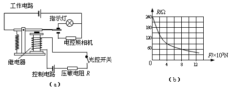 5、实验题 某同学设计了一种“闯红灯违规证据模拟记录器”,如图(a)所示,它可以通过拍摄照片来记录机动车辆闯红灯时的情景。它的工作原理是:当光控开关接收到某种颜色光时,开关自动闭合,且当压敏电阻受到车的压力,它的阻值变化引起电流变化达到一定值时,继电器的衔铁就被吸下,工作电路中的电控照相机就工作,拍摄违规车辆。光控开关未受到该种光照射就自动断开,衔铁不被吸引,工作电路中的指示灯发光。