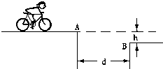 5、简答题 如图所示,骑车人欲穿过宽度d=2m的壕沟AB,现已知两沟沿的高度差h=0.8m.求车速至少多大才能安全穿跃.(g取10m/s2)