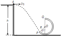 1、简答题  如图所示,竖直平面内有一粗糙的圆弧圆管轨道,其半径为R=0.5m,内径很小.平台高h=1.9m,一质量m=0.5kg、直径略小于圆管内径的小球,从平台边缘的A处水平射出,恰能沿圆管轨道上P点的切线方向进入圆管内,轨道半径OP与竖直线的夹角为37°.g=10m/s2,sin37°=0.6,cos37°=0.8.不计空气阻力.求: