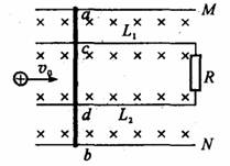 3、简答题 如图所示为某一装置的俯视图,M、N为两个竖直放置的平行金属板,相距为0.4 m,L1和L2为与M、N平行的两根金属导轨(两导轨较细,与M、N上边棱处于同一水平面),L1与M以及L2与N的间距都是0. 1 m,两导轨的电阻不计,其右端接有R="0." 3Ω的电阻.现有一长为0. 4 m、电阻为0.2Ω的均匀金属导体棒ab,棒上的a、b、c、d四点分别与M、 N、L1、L2接触良好,且金属棒ab与金属板M、N正交,整个装置放在竖直向下的匀强磁场中.今有一带正电粒子(不计重力)以v0="7" m/s的初速度平行于极板水平入射.求当金属棒ab向何方向以多大速度运动时,可使带电粒子做匀速直线运动?