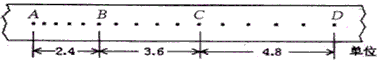 2、填空题 在用打点计时器做测定小车做匀变速直线运动的加速度实验中,已知打点计时器所用的电源频率为50Hz,得到的纸带如图所示。则打点计时器打B点时小车的即时速度为_____________m/s,物体运动的加速度为_____________m/s2。