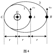 1、选择题 如图4所示,带正电的点电荷O固定,另外有两个质量相等、电荷量相同的点电荷A、B分别在点电荷O的电场力的作用下沿1、2两轨道运动,其中电荷A沿半径为的圆轨道1以速度